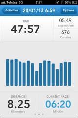 This morning I ran just over 8km. The whole way. Without stopping. I'm aiming for 10km but after that I'm not sure what. Running for more than an hour just seems kinda boring. I play music during my runs and get little updates on how I'm doing with the Runkeeper app. My shuffle button is quite intuitive too... every time I feel like stopping and walking a peppy upbeat song comes on and off I go! To name a few... Pat Benatar (All Fired Up), Transvision Vamp (I Want Your Love), Guns and Roses (Civil War), Madonna (Like a Virgin, Express Yourself, Like a Prayer), Bonnie Tyler (Faster than the Speed of Light), Tina Turner (The Best, Nutbush City Limits, Proud Mary), Cindy Lauper (Girls Just Want to Have Fun), Aerosmith (Janie's Got a Gun) and when the going gets really tough on comes Eye of the Tiger!